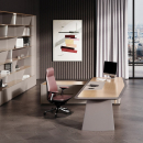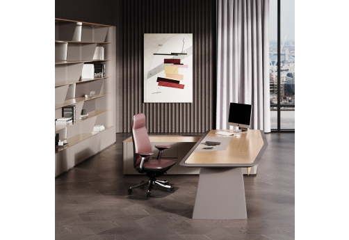 Элитная мебель в кабинет руководителя. Столешницы со сложной кромкой с обратным скосом. Благородные цвета, высококачественные материалы. Тумбы с коммуникационными блоками, шкафы с подсветкой.
