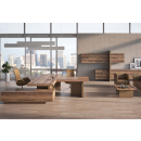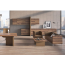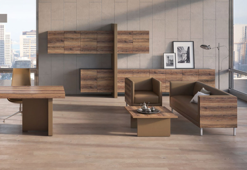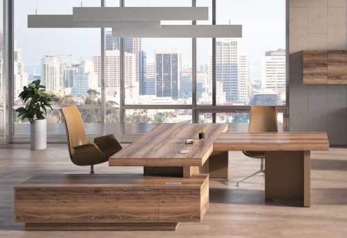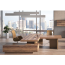 Мебель для кабинета руководителя премиум-класса - монолитные столешницы, геометрия линий, цвета материалов под натуральное дерево, отделка качественной экокожей, шкаф-тотем со светодиодной подсветкой, встроенные кабель-каналы, механизм push-to-open.