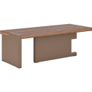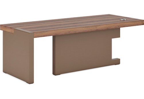 Мебель для кабинета руководителя премиум-класса - монолитные столешницы, геометрия линий, цвета материалов под натуральное дерево, отделка качественной экокожей, шкаф-тотем со светодиодной подсветкой, встроенные кабель-каналы, механизм push-to-open.