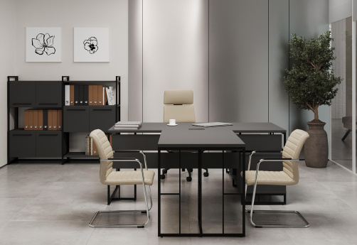 Минималистичный стиль лофт, дизайнерские опоры у столов руководителей, журнальных столов, столов для переговоров, металлические каркасы у стеллажей, наборные шкафы - все это современная серия Миллениум Директ.