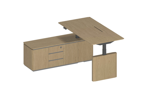 Стол руководителя с подъемным электрическим механизмом с памятью 4 уровней высоты. Две телескопические колонны 80х50 мм, выдвижная часть 75х45 мм, в каждой установлен электрический мотор для регулировки высоты от 73 до 122 см. Панель управления с разъемом для USB зарядки, укомплектована LCD дисплеем с 4 кнопками памяти. Верхний выдвижной ящик оснащен электронным сенсорным замком с возможностью открывания по отпечатку пальца.