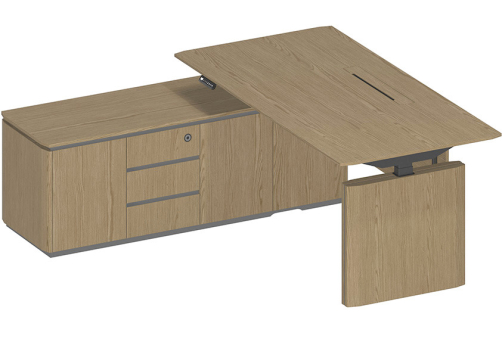 Стол руководителя с подъемным электрическим механизмом с памятью 4 уровней высоты. Две телескопические колонны 80х50 мм, выдвижная часть 75х45 мм, в каждой установлен электрический мотор для регулировки высоты от 73 до 122 см. Панель управления с разъемом для USB зарядки, укомплектована LCD дисплеем с 4 кнопками памяти. Верхний выдвижной ящик оснащен электронным сенсорным замком с возможностью открывания по отпечатку пальца.