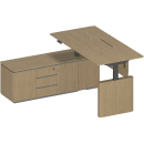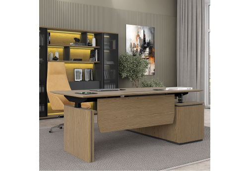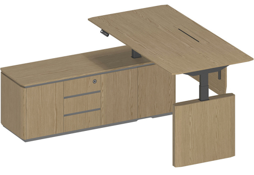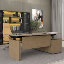 Стол руководителя с подъемным электрическим механизмом с памятью 4 уровней высоты. Две телескопические колонны 80х50 мм, выдвижная часть 75х45 мм, в каждой установлен электрический мотор для регулировки высоты от 73 до 122 см. Панель управления с разъемом для USB зарядки, укомплектована LCD дисплеем с 4 кнопками памяти. Верхний выдвижной ящик оснащен электронным сенсорным замком с возможностью открывания по отпечатку пальца.