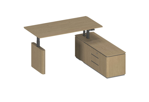 Стол руководителя с подъемным электрическим механизмом с памятью 4 уровней высоты. Две телескопические колонны 80х50 мм, выдвижная часть 75х45 мм, в каждой установлен электрический мотор для регулировки высоты от 73 до 122 см. Панель управления с разъемом для USB зарядки, укомплектована LCD дисплеем с 4 кнопками памяти. Верхний выдвижной ящик оснащен электронным сенсорным замком с возможностью открывания по отпечатку пальца.