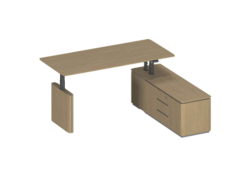 Стол руководителя с подъемным электрическим механизмом с памятью 4 уровней высоты. Две телескопические колонны 80х50 мм, выдвижная часть 75х45 мм, в каждой установлен электрический мотор для регулировки высоты от 73 до 122 см. Панель управления с разъемом для USB зарядки, укомплектована LCD дисплеем с 4 кнопками памяти. Верхний выдвижной ящик оснащен электронным сенсорным замком с возможностью открывания по отпечатку пальца.