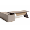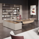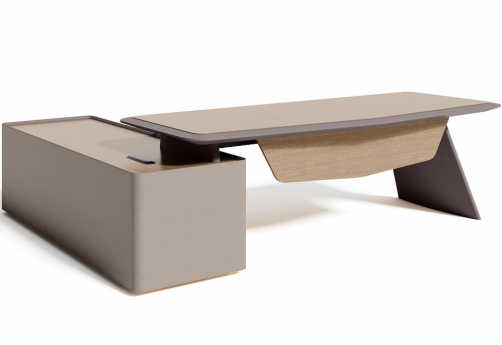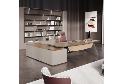 Элитная мебель в кабинет руководителя. Столешницы со сложной кромкой с обратным скосом. Благородные цвета, высококачественные материалы. Тумбы с коммуникационными блоками, шкафы с подсветкой.
