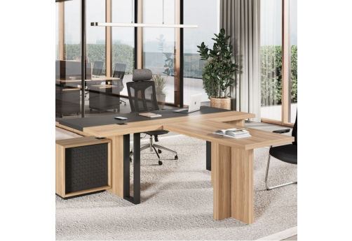 Серия Франклин Люкс – комфортная мебель в кабинет руководителя. Столы на дизайнерском металлокаркасе в актуальном цвете дуб в сочетании с антрацитом. Прямые линии, современный дизайн, элементы домашнего уютного кабинета.