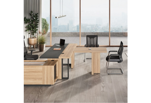 Серия Франклин Люкс – комфортная мебель в кабинет руководителя. Столы на дизайнерском металлокаркасе в актуальном цвете дуб в сочетании с антрацитом. Прямые линии, современный дизайн, элементы домашнего уютного кабинета.