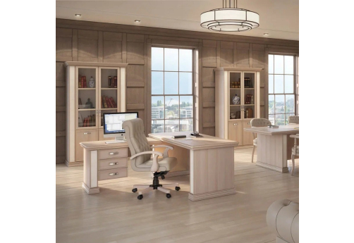 Кабинет Ровер для любителей старой доброй классики. Столы с накладными бюварами (на выбор черного, зеленого или серого цвета). Тумбы, шкафы, греденции с элементами из профиля МДФ. Фурнитура под состаренное серебро. И, конечно, высокое качество исполнения мебели.