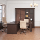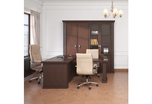 Кабинет Ровер для любителей старой доброй классики. Столы с накладными бюварами (на выбор черного, зеленого или серого цвета). Тумбы, шкафы, греденции с элементами из профиля МДФ. Фурнитура под состаренное серебро. И, конечно, высокое качество исполнения мебели.