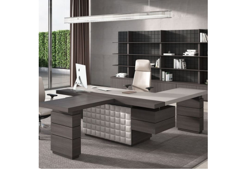 Серия Инфинити предлагает столы для руководителя c подвесными тумбами, столешницами обтянутыми экокожей, с различными передними панелями, оригинальными опорами. Особенность серии - дизайнерская панель шкафа, выполненная из МДФ.