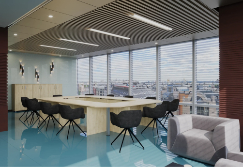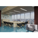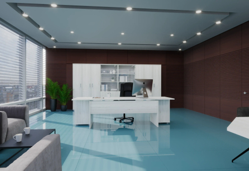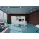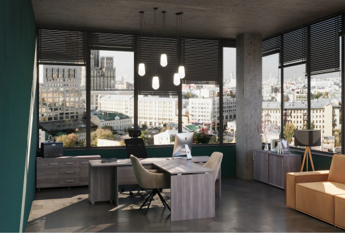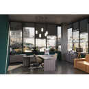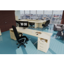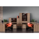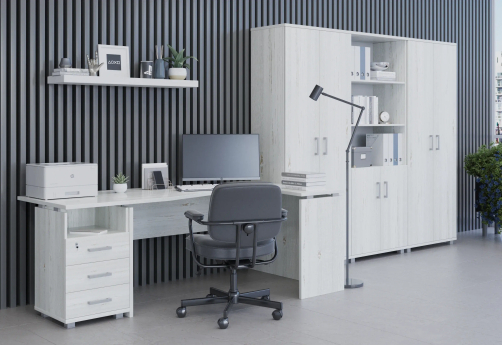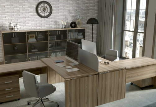 Классический дизайн, столы с «парящей» столешницей, с алюминиевыми проставками. Фурнитура - матовые ручки и квадратные опоры на тумбах и шкафах. Фактура ЛДСП сделана по технологии тиснения «шпон».