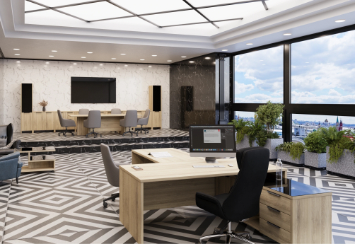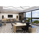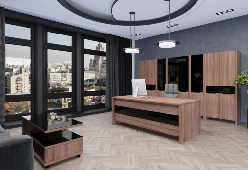 Амстердам - мебель в кабинет руководителя, выполненная в современном дизайне. Особенность серии: декор из полированного стекла лакобель, толстые столешницы, сборные столы для заседаний и конференций, актуальные цвета ЛДСП.
