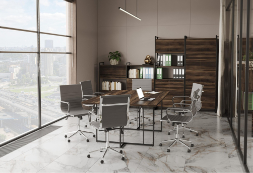 Минималистичный стиль лофт, дизайнерские опоры у столов руководителей, журнальных столов, столов для переговоров, металлические каркасы у стеллажей, наборные шкафы - все это современная серия Миллениум Директ.