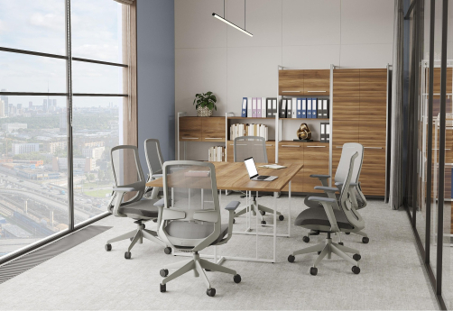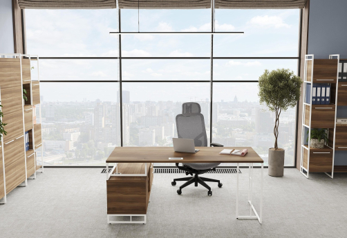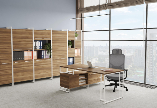 Минималистичный стиль лофт, дизайнерские опоры у столов руководителей, журнальных столов, столов для переговоров, металлические каркасы у стеллажей, наборные шкафы - все это современная серия Миллениум Директ.