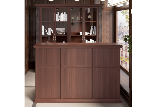 Кабинет Ровер для любителей старой доброй классики. Столы с накладными бюварами (на выбор черного, зеленого или серого цвета). Тумбы, шкафы, греденции с элементами из профиля МДФ. Фурнитура под состаренное серебро. И, конечно, высокое качество исполнения мебели.
