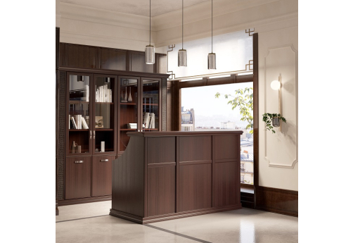 Кабинет Ровер для любителей старой доброй классики. Столы с накладными бюварами (на выбор черного, зеленого или серого цвета). Тумбы, шкафы, греденции с элементами из профиля МДФ. Фурнитура под состаренное серебро. И, конечно, высокое качество исполнения мебели.