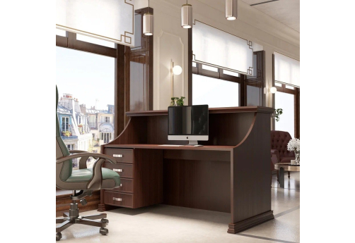 Кабинет Ровер для любителей старой доброй классики. Столы с накладными бюварами (на выбор черного, зеленого или серого цвета). Тумбы, шкафы, греденции с элементами из профиля МДФ. Фурнитура под состаренное серебро. И, конечно, высокое качество исполнения мебели.
