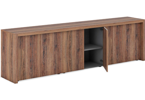 Мебель для кабинета руководителя премиум-класса - монолитные столешницы, геометрия линий, цвета материалов под натуральное дерево, отделка качественной экокожей, шкаф-тотем со светодиодной подсветкой, встроенные кабель-каналы, механизм push-to-open.