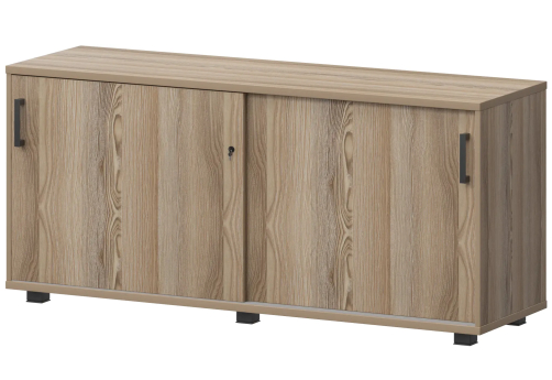 Классический дизайн, столы с «парящей» столешницей, с алюминиевыми проставками. Фурнитура - матовые ручки и квадратные опоры на тумбах и шкафах. Фактура ЛДСП сделана по технологии тиснения «шпон».