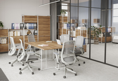 Минималистичный стиль лофт, дизайнерские опоры у столов руководителей, журнальных столов, столов для переговоров, металлические каркасы у стеллажей, наборные шкафы - все это современная серия Миллениум Директ.