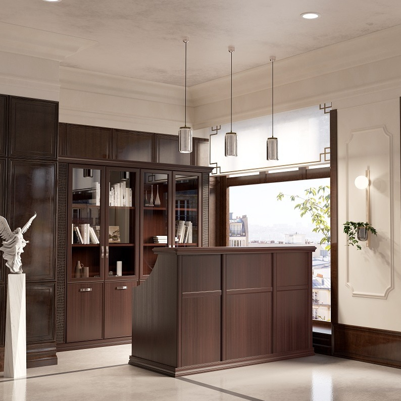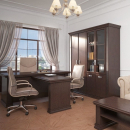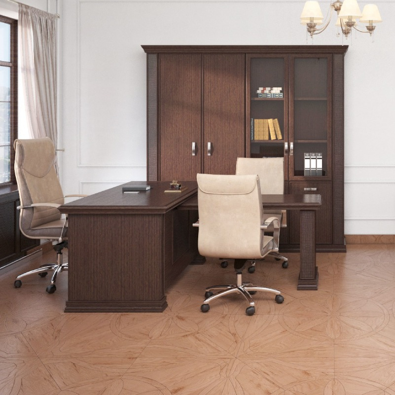 Статная, добротная, бюджетная классика - коллекция корпусной мебели "Ровер" - подойдет для кабинета руководителя, как женщины, так и мужчины. Основной материал - ЛДСП, представленный в двух противоположных оттенках: ровер и дуб. Особенной эту коллекцию делают вставки из винилискожи, облицовка торцов МДФ, стильная металлическая фурнитура, что в совокупности выглядит роскошно. В коллекции представлены столы с массивными столешницами с бордюрами, функциональные шкафы, тумбы, греденции и роскошные стойки для администратора. Эта коллекция отлично подчеркнет строгость руководителя и задаст деловую атмосферу в кабинете.