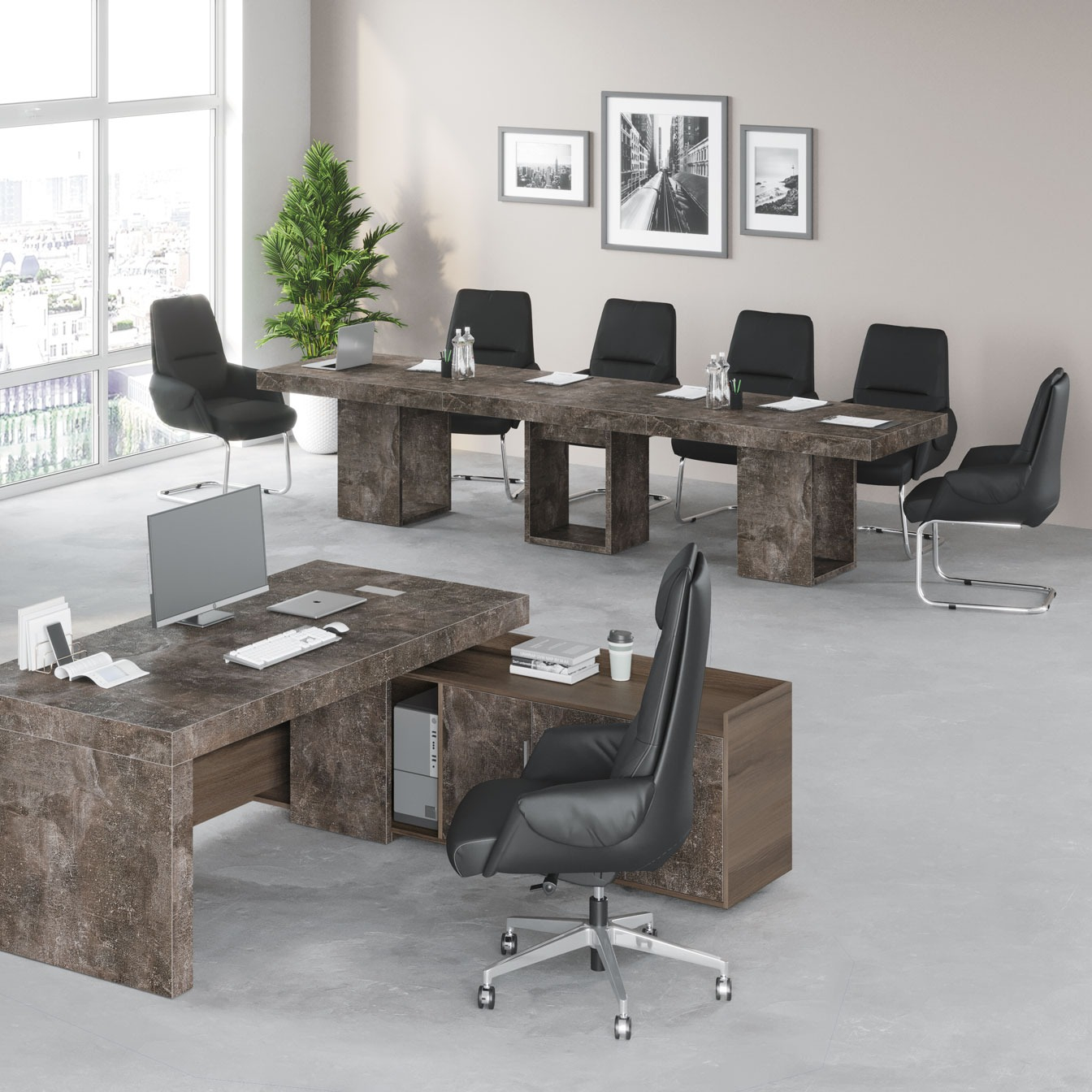 Я такой увидел у наших партнеров в офисе, они же и подсказали этот магазин. Стол шикарный, и прежде всего тем, что он отличается от обычных офисных столов. Смотрится серьезно и основательно и придает уверенность. Столешница имеет толщину 100 мм, что в 4 раза больше стандартной, поэтому выдержать может все что угодно. Да и опоры под стать ей. Так что единственный минус, что он достаточно тяжелый, и самому передвинуть его на другое довольно сложно.