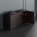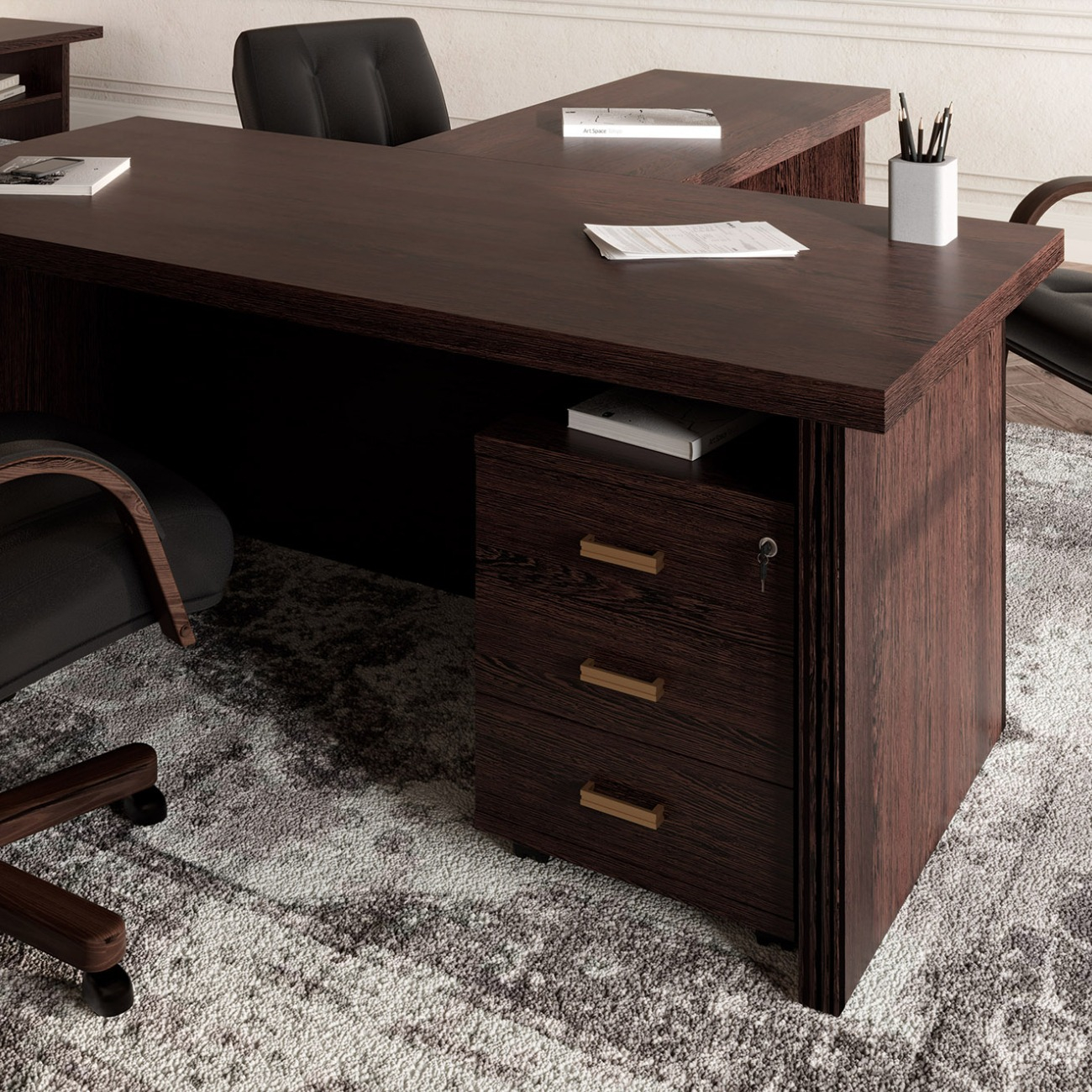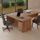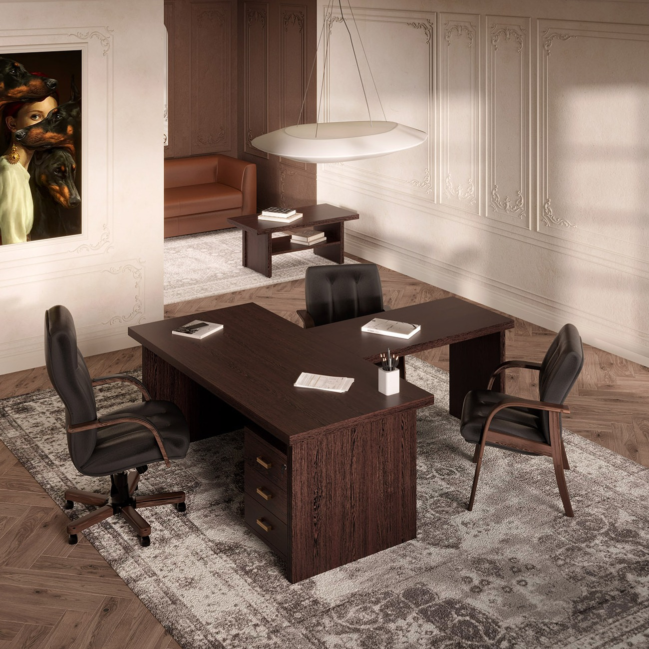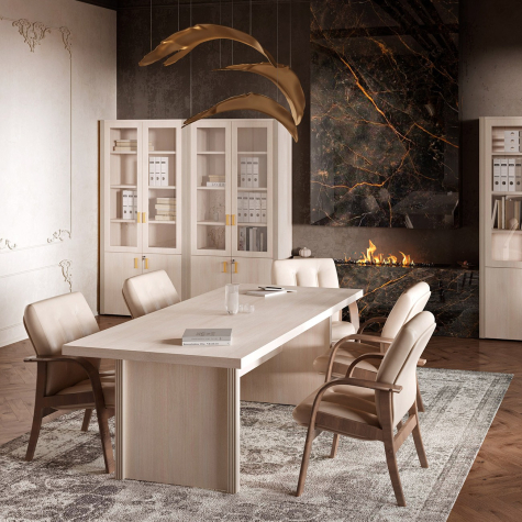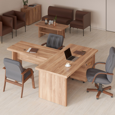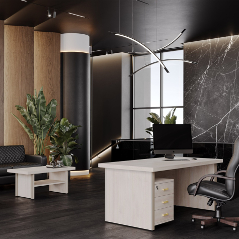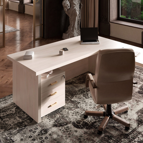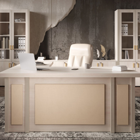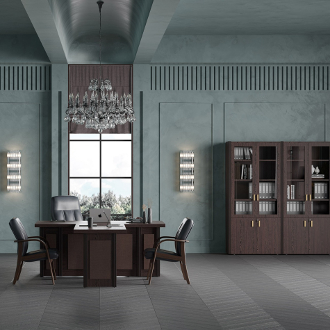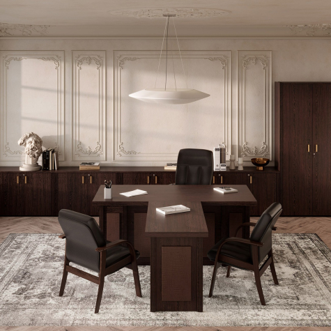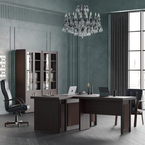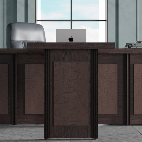 Визави – роскошная, эффектная и при этом вполне доступная мебель для кабинета руководителя. Особенности коллекции – оригинальные декоративные вставки из искусственной кожи, массивные столешницы и топы. В серии Визави две модели рабочих столов с прямой или закругленной столешницей, удобные тумбы и шкафы, функциональная приставка с поворотным мини-баром.
