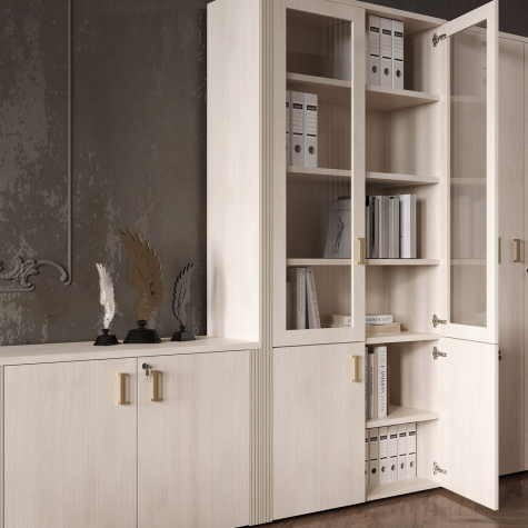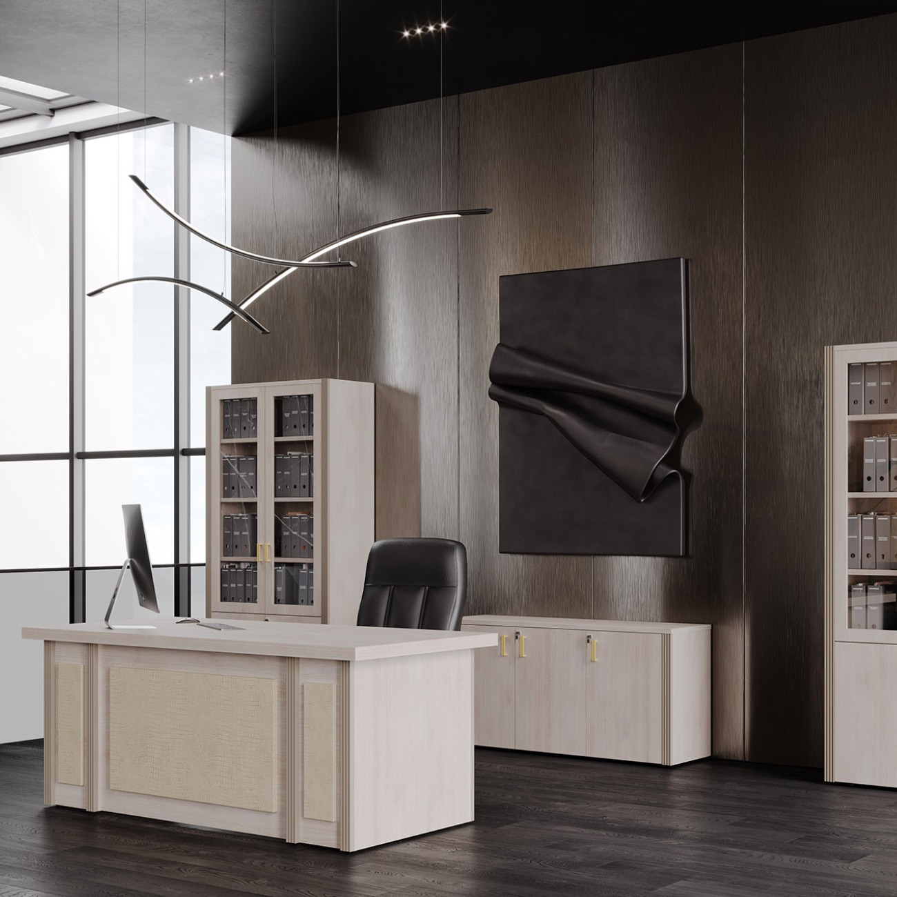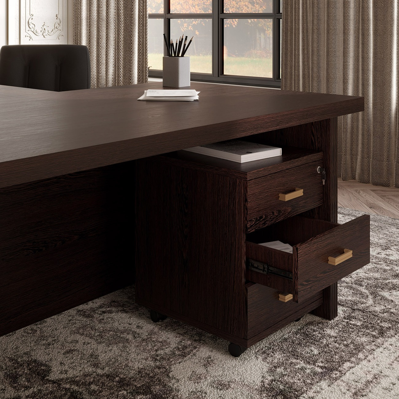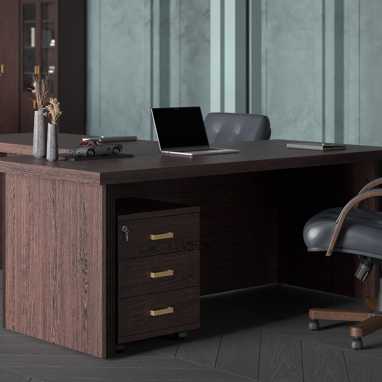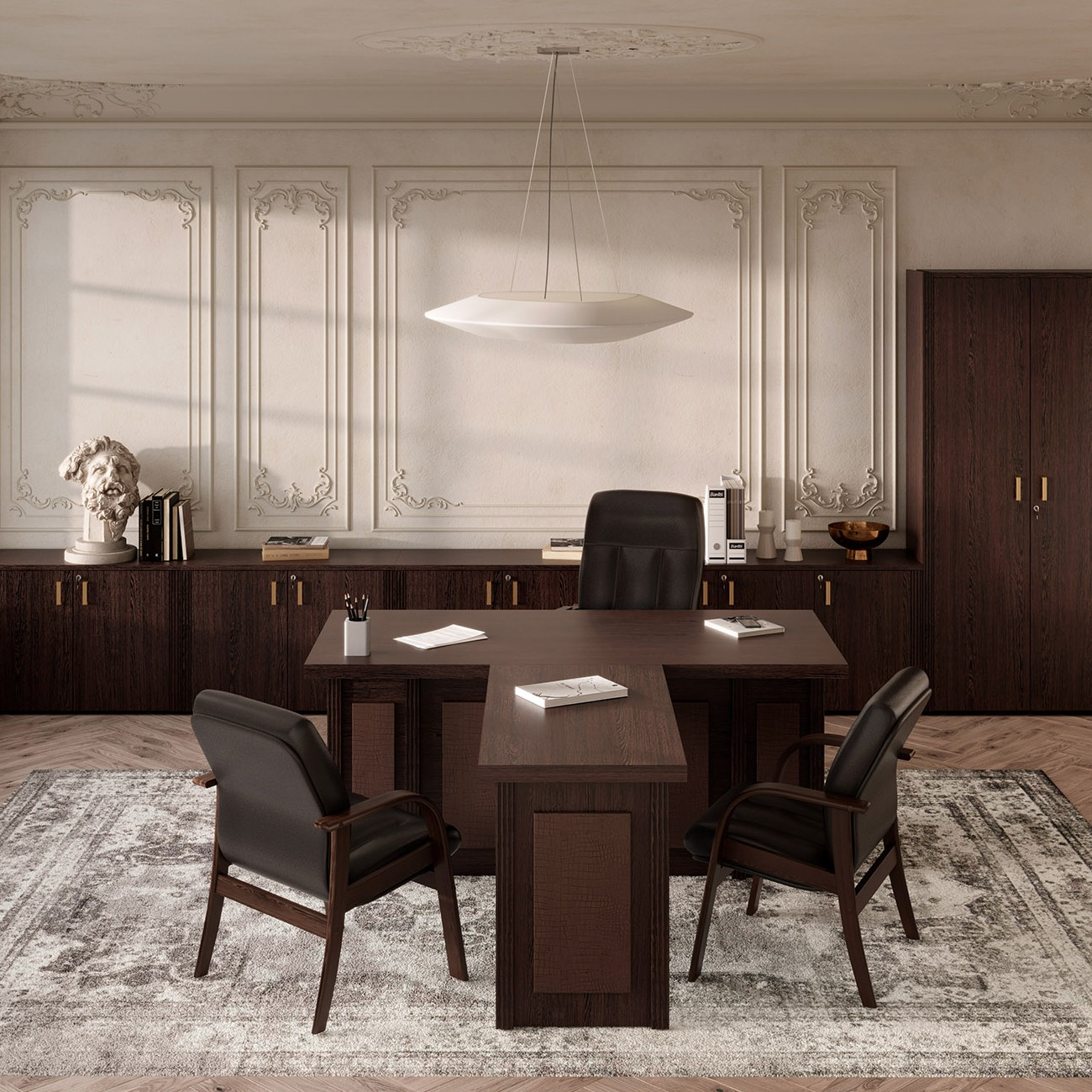 Визави – роскошная, эффектная и при этом вполне доступная мебель для кабинета руководителя. Особенности коллекции – оригинальные декоративные вставки из искусственной кожи, массивные столешницы и топы. В серии Визави две модели рабочих столов с прямой или закругленной столешницей, удобные тумбы и шкафы, функциональная приставка с поворотным мини-баром.