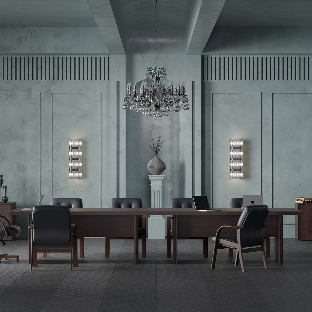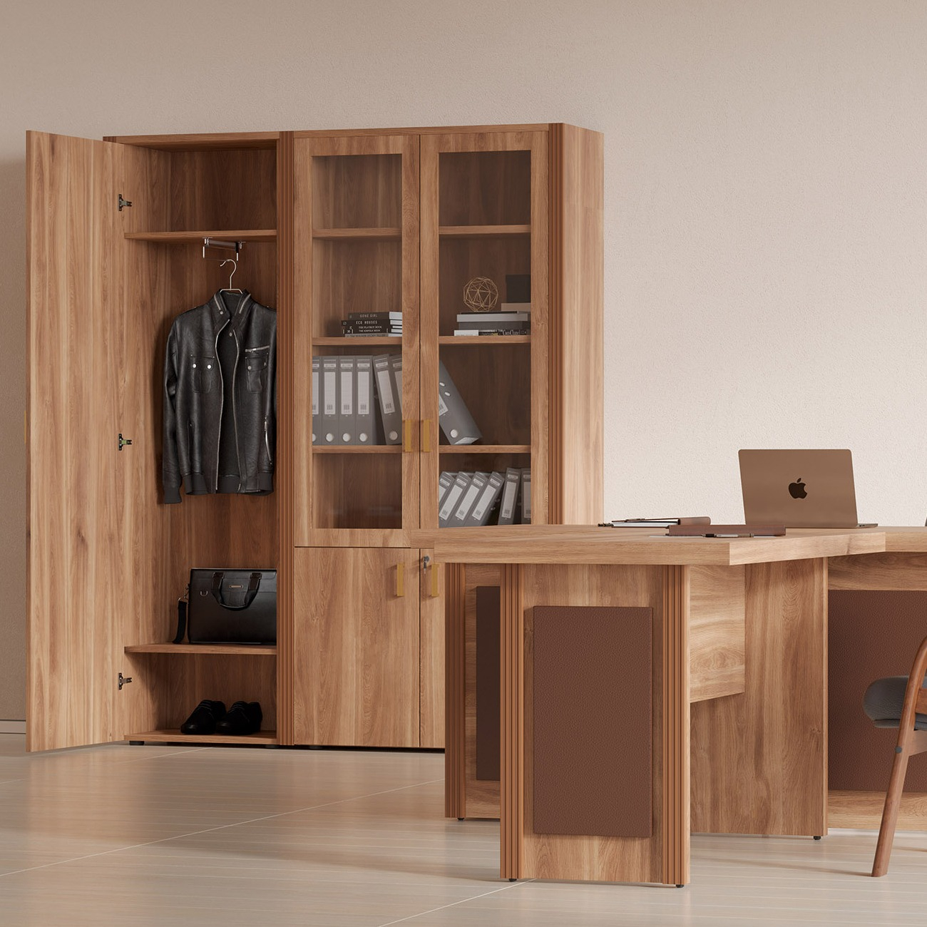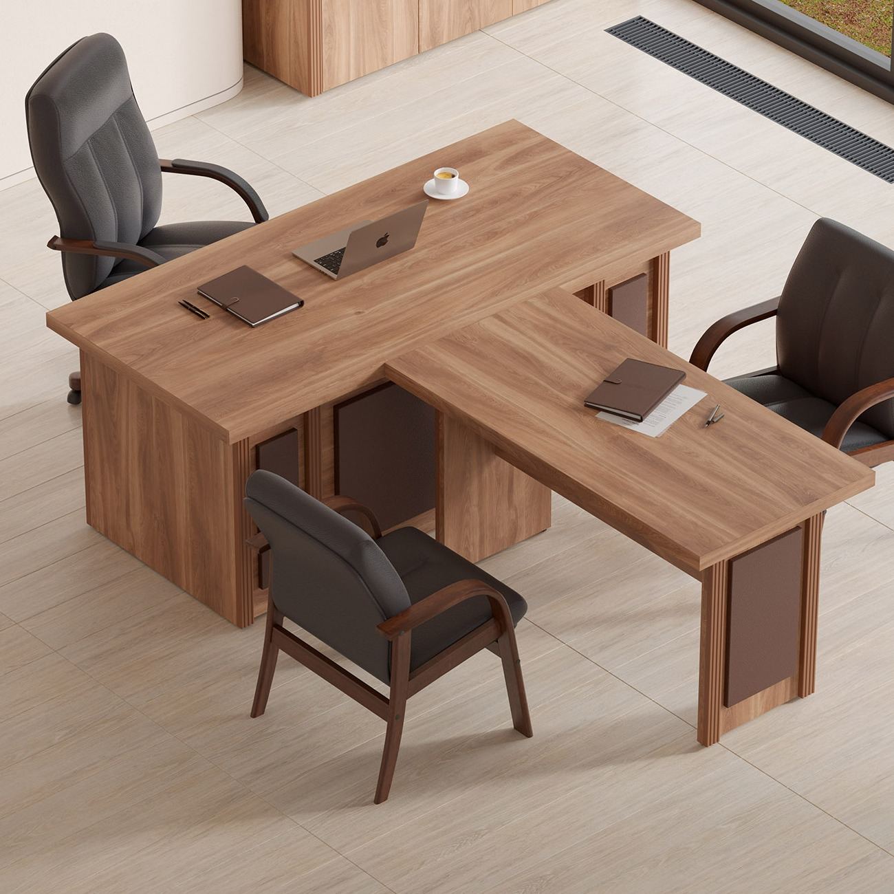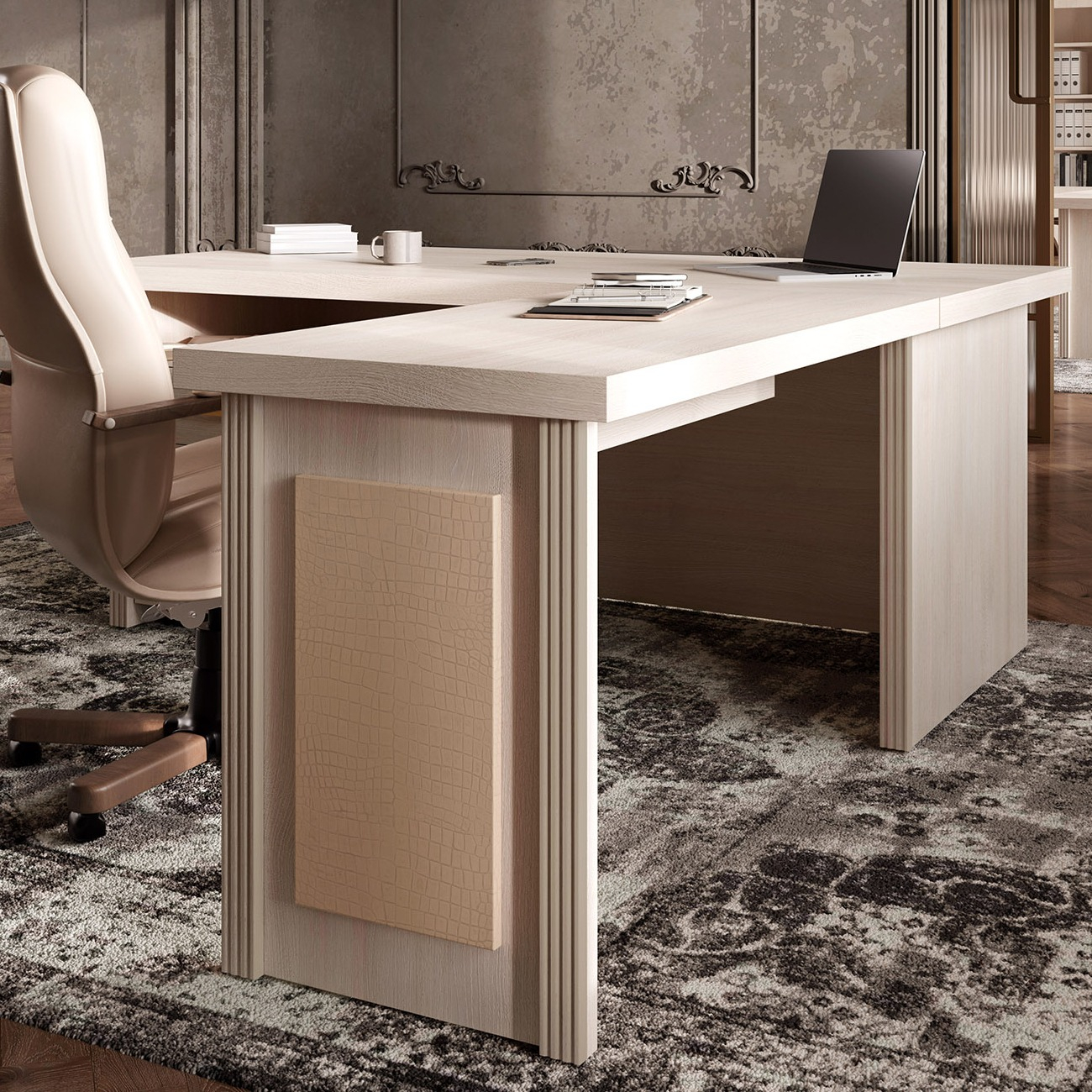 Визави – роскошная, эффектная и при этом вполне доступная мебель для кабинета руководителя. Особенности коллекции – оригинальные декоративные вставки из искусственной кожи, массивные столешницы и топы. В серии Визави две модели рабочих столов с прямой или закругленной столешницей, удобные тумбы и шкафы, функциональная приставка с поворотным мини-баром.